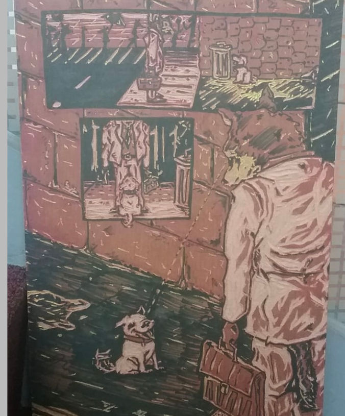 Reductive print "A Ruff Night Fur Mr.Dog-Man." I ended up making 32 of these, with 9 being in the perfect edition. Mr.Dog-Man was based off my 13 year old dog, Jake.